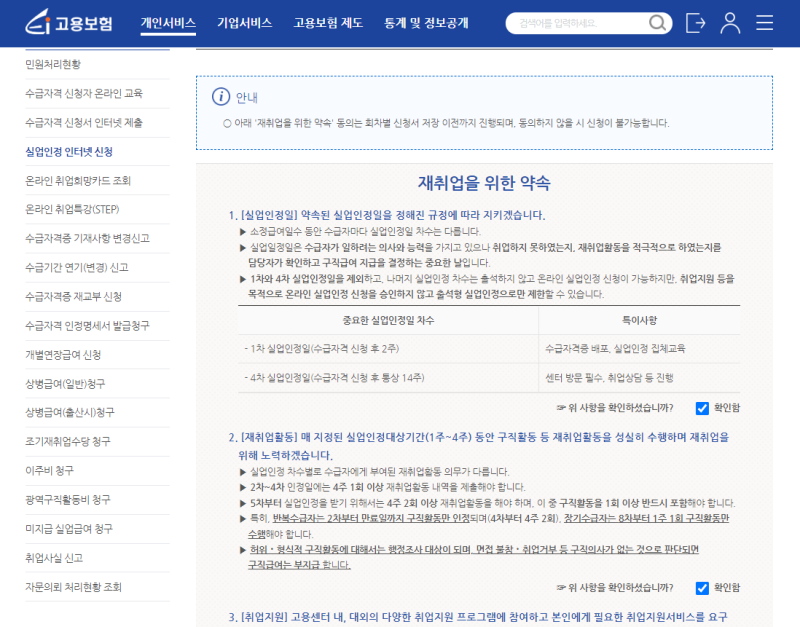 실업인정 인터넷 신청 버튼을 누르고 재취업을 위한 약속에 동의하면 다음 페이지로 넘어갈 수 있다.