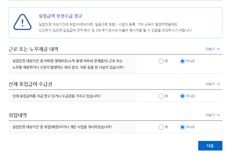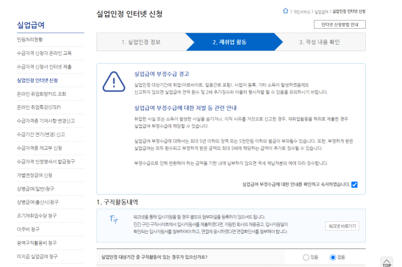 본인이 속한 부분에 체크 표시와 실업급여 부정수급 경고에 대해 동의해주고