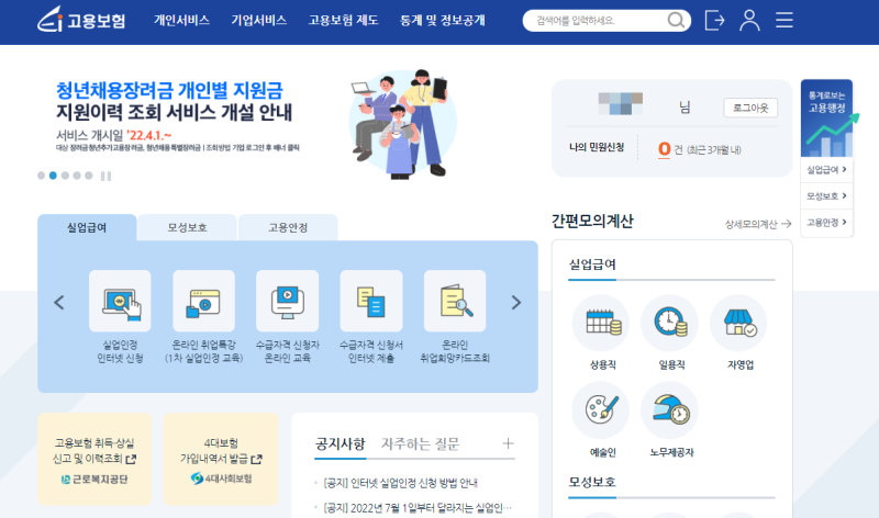 고용보험 홈페이지에 접속하면 대표적인 페이지로 이동하는 버튼이 많다.
