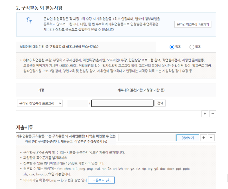 구직활동을 했다면 구직활동에 대해 상세히 입력해주고 구직활동의 형태에 따라 다양한 제출방법이 있다.
