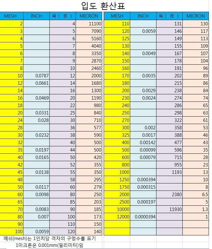 입도를 표기하는 메쉬, 미크론(마이크로), 인치, 목 등 단위의 환산표 입니다