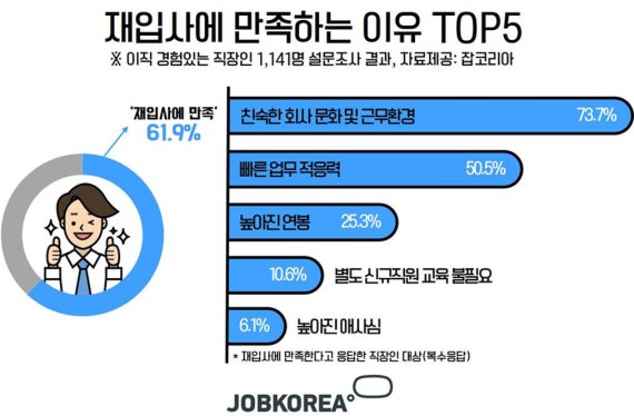 잡코리아가 재입사에 만족하는지를 묻자 61.9%가 ‘만족한다’고 응답한 것.