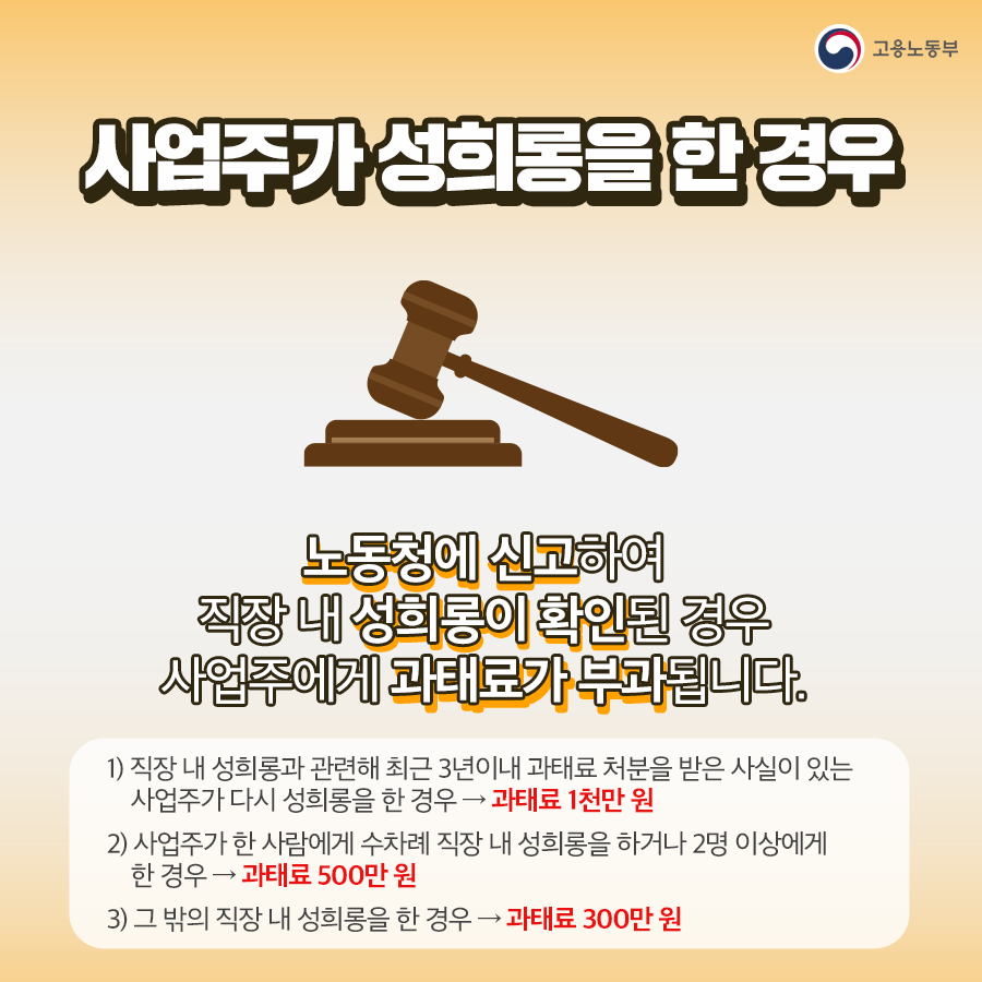 사업주가 성희롱을 한 경우 노동청에 신고하여 직장 내 성희롱이 확인된 경우 사업주에게 과태로가 부과됩니다.