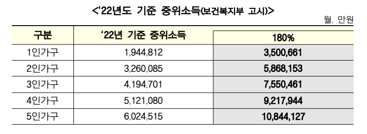 ‘23.7월부터는 직전 과세기간(’22.1~12월) 소득이 확정됨에 따라 ‘22년 기준 개인소득, 가구소득으로 가입가능여부 확인이 이루어지며, ‘22년 중 최초로 소득이 발생한 사회 초년생도 가입신청이 가능하다. - 1 - 가구소득의 경우 가입 신청자 본인을 포함한 가구원 소득의 합(‘22년 기준)이 보건복지부에서 고시하는 ‘22년도 기준 중위소득의 180% 이하를 충족하여야 한다. 가구원은 원칙적으로는 가입 신청자의 주민등록등본에 기재된 배우자, 부모, 자녀, 미성년 형제·자매를 기준으로 판단*한다.