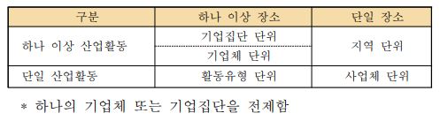 사업체 단위는 공장, 광산, 상점, 사무소 등과 같이 산업활동과 지리적 장소의 양면에서 가장 동질성이 있는 통계단위이다. 이 사업체 단위는 일정한 물리적 장소에서 단일 산업활동을 독립적으로 수행하며, 영업잉여에 관한 통계를 작성할 수 있고 생산에 관한 의사결정에 있어서 자율성을 갖고 있는 단위이므로 장소의 동질성과 산업 활동의 동질성이 요구되는 생산통계 작성에 가장 적합한 통계단위라고 할 수 있다. 그러나 실제 운영면에서 사업체 단위에 대한 정의가 엄격하게 적용될 수 있는 것은 아니다. 실제 운영상 사업체 단위는 “일정한 물리적 장소 또는 일정한 지역 내에서 하나의 단일 또는 주된 경제활동에 독립적으로 종사하는 기업체 또는 기업체를 구성하는 부분 단위”라고 정의할 수 있다. 한편, 기업체 단위란 재화 및 서비스를 생산하는 법적 또는 제도적 단위의 최소 결합체로서 자원 배분에 관한 의사결정에서 자율성을 갖고 있다. 기업체는 하나 이상의 사업체로 구성될 수 있다는 점에서 사업체와 구분되며, 재무관련 통계작성에 가장 유용한 단위이다.