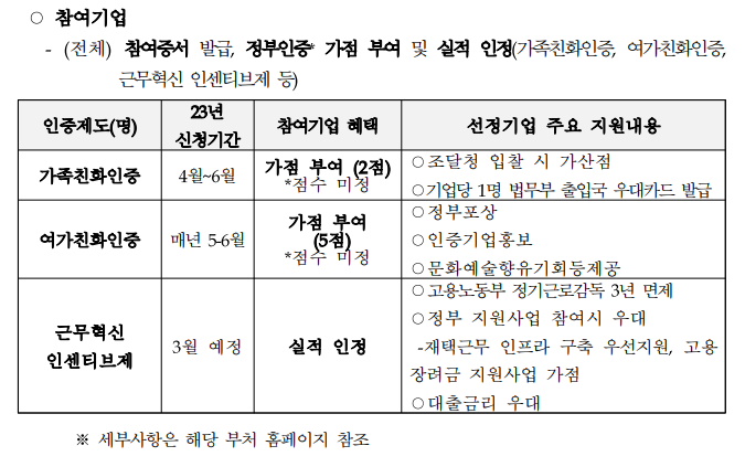 - (전체기업) 참여증서, 정부인증 가점 부여 및 실적 인정(가족친화인증, 여가친화인증, 근무혁신 인센티브제 등