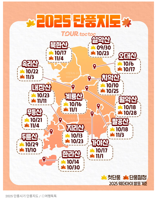 산림청에 따르면, 설악산은 10월 25일경, 속리산은 10월 27일경, 내장산은 11월 6일경, 가야산은 11월 11일경에 절정에 이를 전망입니다. 단풍의 아름다움은 지역과 수종에 따라 다르며, 날씨의 영향으로 예년보다 조금 늦춰지거나 단풍 기간이 짧아질 수도 있습니다.