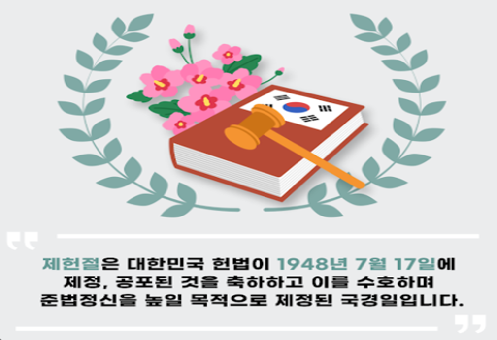 | 7월17일은 제77주년 제헌절 매년 7월 17일은 대한민국의 제헌절입니다. 국경일 중 하나인 제헌절은 우리 국민들이 자유롭고 평등하게 살아갈 수 있는 근간을 마련한 대한민국 헌법이 제정된 것을 기념하는 날이에요. 단순한 공휴일을 넘어, 우리 삶에 깊이 뿌리내린 헌법의 가치를 되새겨보는 중요한 날이죠. [ 내용보기 ] |